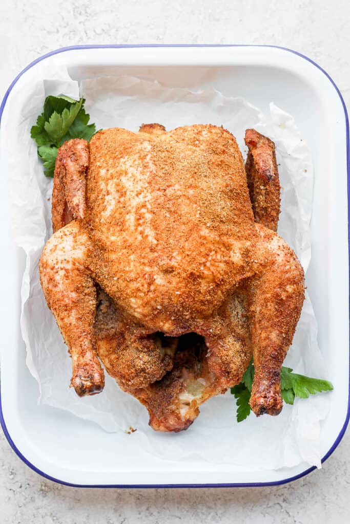 We chose to rub this chicken down in a delicious dry rub because we wanted crispy and crunchy chicken skin. We used a delicious chicken dry rub of sweet and savory spices.