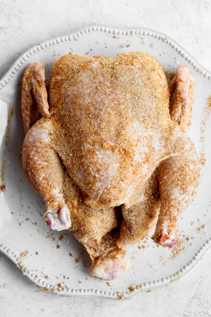 - Carefully sprinkle the rest of the dry rub over the chicken. Massage the dry rub into the skin. Be sure the whole chicken is covered.