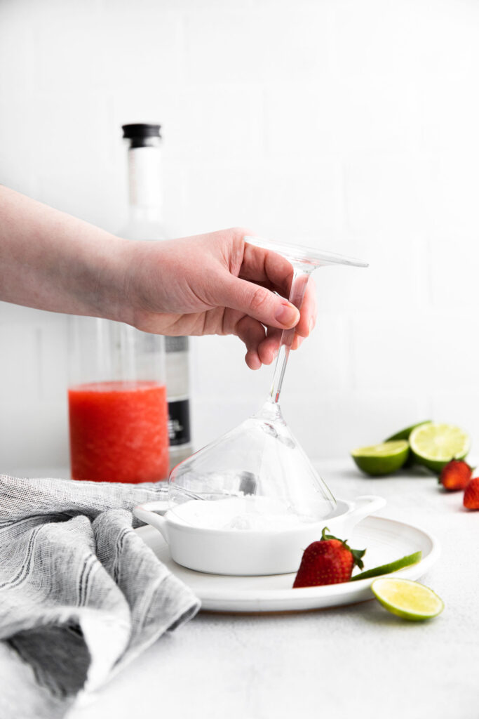 - Dip the rim of your glass into the water and then into the coarse sea salt rocking the glass back and forth.